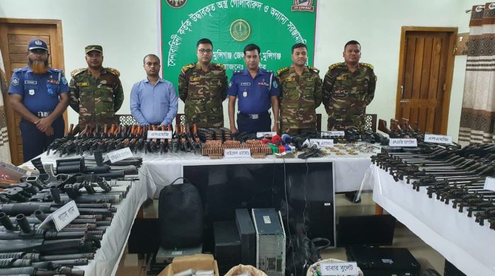 মুন্সিগঞ্জ লুট হওয়া বিপুল পরিমানে অস্ত্র সরঞ্জাম উদ্ধার, পুলিশের কাছে হস্তান্তর।