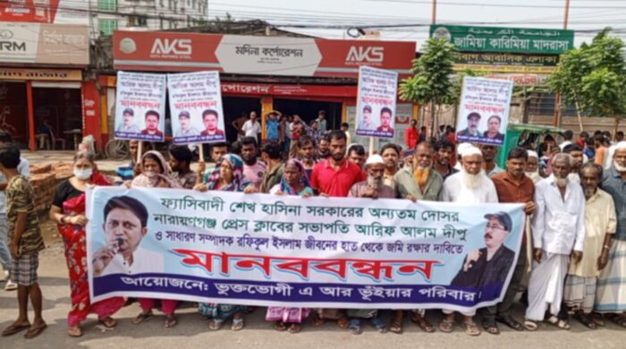 নারায়ণগঞ্জ প্রেসক্লাবের সভাপতি-সেক্রেটারীর বিরুদ্ধে ভূমিদস্যুতার অভিযোগে মানববন্ধন